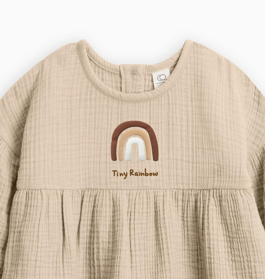 Organic Cotton Tiny Rainbow Puff Kids Muslin Dress | Kids Rainbow Long Sleeve Dress | Toddler Rainbow Muslin Dress