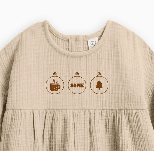 Personalized Christmas Ornaments Kids Muslin Dress | Organic Cotton Christmas personalized Long Sleeve Dress